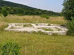 Při zkoumání pozůstatků stavby byly objeveny nálezy důležité pro její datování. Jde zejména o římskou keramiku, vícebarevné mozaikové sklo, bronzové spony, římské mince apod. Výjimečným nálezem z tohoto území je drobná bronzová plastika představující starořeckého boha plodnosti Priapa.