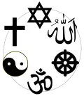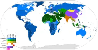 Jako světová náboženství (anglicky World religions) jsou zpravidla označována světově rozšířená náboženství, které mají největší počet vyznavačů po celém světě, mezi ně se zpravidla řadí křesťanství, islám, judaismus, hinduismus a buddhismus. K pěti hlavním bývá často přičítán sikhismus, případně také zoroastrismus, který dominoval ve starověku na Blízkém východě a je považován za nejstarší světové náboženství vůbec, ale ustoupil kvůli islámské expanzi. Za světová jsou někdy považována také méně rozšířená univerzální náboženství jako džinismus a bahá’í.[2] Méně, ale stále velmi často, se uvádí také východoasijská náboženství taoismus, konfuciánství a šintoismus, která však mohou být zahrnuta pod termíny jako čínská nebo japonská.