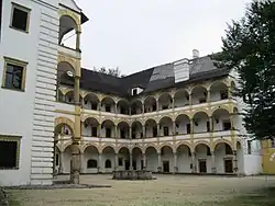 Z části otevřené nádvoří zámku s třemi patry arkád