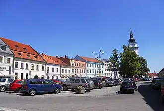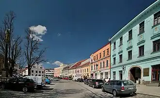 ![]() Střed města od severu. V popředí řeka Oslava, vlevo Nová synagoga, vpravo kostel svatého Mikuláše. | |