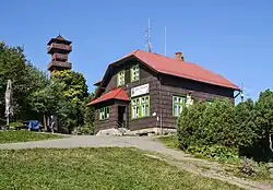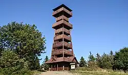 Na vrcholu byla také postavena rozhledna už v roce 1934 (původně se jednalo o triangulační věž). Jednalo se o třináct metrů vysokou dřevěnou věž postavenou v roce 1929 pro potřeby Zeměmeřičského úřadu a upravenou do podoby rozhledny v roce 1934.[3] Odstraněna byla v roce 1967 kvůli havarijnímu stavu.