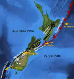 Velký alpský zlom vznikl, stejně jako pohoří Jižní Alpy které protíná, v období Kaikourské orogeneze přibližně před 25 milióny roků. Jedná se o asi 500 kilometrů dlouhý zlom oddělující vyšší severozápadní část ostrova včetně nejvyššího vrcholu Mount Cook, ležící na Australské desce, od nižší části jihovýchodní přináležející k Tichomořské desce; stýkají se zde svory a žuly. Tichomořská deska se podsunuje pod úhlem 40 stupňů pod desku Australskou (tzv. subdukce) čímž jsou Jižní Alpy vyzvedávány asi o 7 milimetrů za rok. Přitom dochází k výlevům magmatu což vytváří na Severním ostrově sopečnou zónu, pod Tichomořskou deskou na Jižním ostrově pak vznikají zemětřesení. Současně se Tichomořská deska také otáčí proti směru hodinových ručiček. V důsledku toho byly horniny podél zlomu posunuty o více než 500 kilometrů. Tento transformní zlom je velmi výrazným geomorfologickým útvarem – je dobře viditelný jako prasklina procházející krajinou ze Země i z vesmíru.