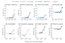 V řadě srovnávacích testů přirozeného jazyka zahrnujících úkoly jako odpovídání na otázky, nefungují modely lépe než náhodná odpověď, dokud nedosáhnou určité velikosti (v tomto případě měřené výpočetními náklady na jejich vznik). Pak se jejich výkon prudce zvýší. To jsou příklady emergentních schopností.