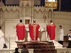 Na Velký pátek se neslaví mše svatá, ani nejsou povoleny pohřební obřady. V katolické liturgii se čtou z Písma Janovy pašije, někdy podané dramaticky nebo hudebně. Obřady pokračují přímluvnou modlitbou za církev, za papeže, za služebníky církve a za všechny věřící, za katechumeny, za jednotu křesťanů, za Židy, za ty, kdo věří v Boha, ale nevěří v Krista, za ty, kdo nevěří v Boha, za politiky a státníky, za ty, kdo trpí. Vrcholem obřadů je uctívání kříže. Eucharistie se v tento den neslaví. Podává se však svaté přijímání (z hostií, jež byly proměněny na Zelený čtvrtek). Výjimky se objevují jen velmi vzácně, např. v roce 2009 Svatý stolec povolil sloužení pohřební mše při státním pohřbu 205 obětí zemětřesení, které postihlo kraj Abruzzo ve střední Itálii.[1]