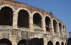 Aréna v jižní části historického města o rozměrech 139 x 110 m, dokončená za císaře Tiberia v roce 30, je třetí největší na světě po římském Koloseu a po amfiteátru v Capui nedaleko Neapole. Aréna pojala téměř 30 tisíc diváků a návštěvníci sem přicházeli z celého Veneta, aby zhlédli bitvy a gladiátorské zápasy. Amfiteátr se proto později využíval k veřejným popravám, veletrhům, divadelním a operním představením a býčím zápasům. Zemětřesení v roce 1117 přečkala pouze čtyři pole ozdobné vnější stěny s mramorovým obkladem. Vnitřní dvoupatrové arkády se 74 oblouky se však zachovaly, stejně jako vnitřek arény. Dnes aréna slouží k divadelním představením, v létě se zde konají divadelní festivaly.