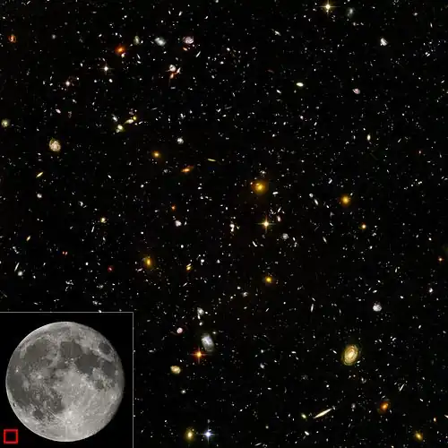 Oblast vesmíru viditelná ze Země (pozorovatelný vesmír) je koule o poloměru přibližně 46 miliard světelných let,[12]; (celý vesmír podle nejnovějších odhadů má zhruba 96 miliard světelných let). Poloměr byl určen z nejvzdálenějších viditelných objektů se zahrnutím rozpínání vesmíru. Pro srovnání: typická galaxie má průměr přibližně 30 000 světelných let a obvyklá vzdálenost mezi dvěma sousedními galaxiemi je 3 milióny světelných let.[24] Například naše Galaxie má průměr zhruba 100 000 světelných let,[25] a galaxie v Andromedě se nachází zhruba ve vzdálenosti 2,5 milionů světelných let od Mléčné dráhy.[26] V pozorovaném vesmíru existuje pravděpodobně více než 100 miliard (1011) galaxií.[27] V roce 2016 britští astronomové odhadli počet galaxií na více než jeden bilion.[28] Velikosti galaxií se pohybují od trpasličích galaxií s méně než deseti miliony (107) hvězd,[29] až po obří eliptické galaxie s biliónem (1012) hvězd,[30] všechny se otáčejí kolem těžiště ve středu galaxie. Z velice hrubého odhadu vyplývá, že v pozorovatelném vesmíru je kolem jedné triliardy hvězd (1021), nicméně v roce 2010 astronomové zveřejnili studii, která došla k číslu 300 triliard hvězd (3×1023).[31]