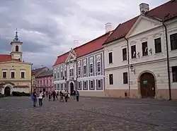 V areálu barokního Biskupského paláce (Püspöki palota) od Jakaba Fellnera z let 1765–1776[6] se dochovala část románsko-gotické kaple bl. Gizely (Gizella-kápolna) s nástěnnými malbami ze 13. století. Před vstupem do hradu stojí na Staroměstském náměstí (maďarsky Óváros tér) pozdně barokní radnice z roku 1793. Mezi další hodnotné stavby patří také Körmendyho dům.[6]