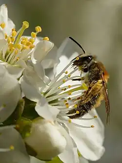 Včela opylující květ višně