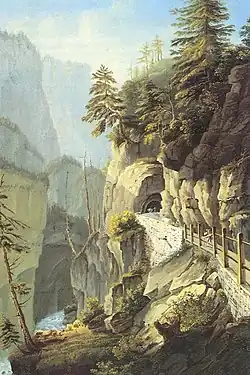 Bernhardinstrasse vedla v severním přístupu s tunely a štolami přes Verloren Loch a eliminovala tak výstup přes Rongeller Höhe. Nadále se používaly tři stávající mosty, mezi nimiž byla ze skály vyražena nová trasa.