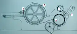 Na nákresu vpravo je znázorněn trhací stroj s podávacími válečky (1), hlavním bubnem s kolíky (2), sítovými bubny (3) a odváděcími válečky (4).