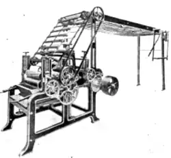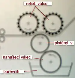 Jedná se o tzv. reliéfový tisk, jehož princip je naznačen na nákresu vpravo: Prameny z česaných vláken prochází (v jedné řadě vedle sebe) mezi dvěma kovovými válci s reliéfovým povrchem a plstěným suknem nasáklým tiskařskou barvou. Přítlakem obou válců na sukno se přenáší barva na česance, na kterých se vytváří diagonální nebo zkřížené pruhy.[2]