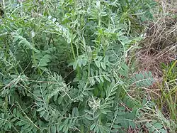 Jednoletá nebo dvouletá rostlina s vystoupavou, popínavou nebo poléhavou lodyhou dlouhou až 130 cm, vyrůstající z tenkého, až 30 cm hluboko sahajícího, hustě rozvětveného kořene. Lodyha je od báze větvená, hranatá a hustě chlupatá. Řapíkaté listy jsou sudozpeřené, mají 6 až 8 párů krátce řapíčkatých lístků a jsou ukončeny rozvětveným úponkem. Lístky jsou úzce eliptické, 15 až 25 mm dlouhé, na vrcholu okrouhlé nebo špičaté, jasně zelené a dlouze chlupaté. Stejně chlupaté jsou i polostřelovité palisty dlouhé 5 až 20 mm.