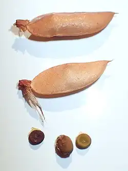 Plodem je rezavohnědý až červenofialový, široce elipsoidní, dvěma chlopněmi pukající lusk dlouhý asi 1,5 cm a široký 0,5 cm, Obsahuje jedno až dvě nahnědlá, skvrnitá, sférická semena. Ploidie druhu je 2n = 12.[1][2][3][4]