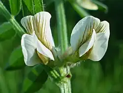 Květy vyrůstají jednotlivě nebo v počtu nejvýše čtyř a vytvářejí hroznovitá květenství v úžlabí listů, stopky květenství i nicích květů jsou dlouhé okolo 5 mm. Kalich je asi 10 mm dlouhý, srostlolupenný, zvonkovitý, dlouze chlupatý, světlezelený a je ukončen pěti zuby, které nebývají stejně dlouhé. Koruna dlouhá 17 až 22 mm je smetanově bílá s okrovými čárkami. V květu je deset dvoubratrých tyčinek (9+1). Semeník mívá krátkou stopku nebo je téměř přisedlý, obsahuje dvě až osm vajíček a je vybaven chlupatou čnělkou s drobnou bliznou opylovánou hmyzem přinášejícím pyl. Květy mají pro opylovače dostatek nektaru, při nedostatku hmyzu je možná i případná samosprašnost květů.