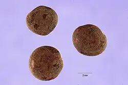 Plod je podlouhlý zploštělý neopadavý lusk velký 25 až 30 mm, jenž bývá zbarvený šedě až hnědě, je svěšený, chlupatý a ve zralostí se otvírá dvěma chlopněmi. Lusk je bez vnitřních přihrádek a obsahuje nejčastěji dvě až osm semen. Ta bývají hladká, kulovitá nebo podlouhlá, velká od 2,5 do 5 mm, jsou světle hnědá či olivově zelenohnědá a na povrchu mívají hnědé, eventuálně černé skvrny.[2][3][6][7][8][9][10]