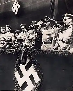 Korunní princ Vilém s páskou s hákovým křížem během SA pochodu, říjen 1933