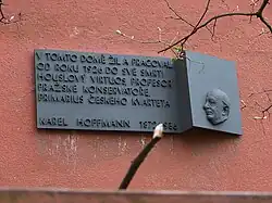 „V tomto domě žil a pracoval od roku 1920 do své smrti houslový virtuos, profesor pražské konservatoře, primárius českého kvarteta Karel Hoffmann „1872-1936“.[4]