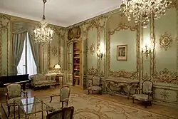 Zvláštním prostorem je hudební salon ve stylu Ludvíka XVI. schovaný za monumentálním schodištěm, který se vyznačuje dekorativním dřevěným obložení se vsazenými malbami. Zrcadlové dveře v koutě salonu ukrývají původní a dnes už prořídlou sbírku not a gramodesek rodiny Petschkovy.