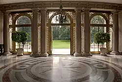 Do dvoupatrové vily návštěvník vstupuje poněkud atypickým vchodem do dvou průchozích šaten, odkud pokračuje do centrální rotundy a zimní zahrady oddělené od venkovní terasy prosklenou stěnou. Po stranách zimní zahrady je k severu pánský pokoj a knihovna, kde je dodnes jediný funkční krb v domě, z jižní strany dámský salon a vedle něj velká jídelna se stolem, za který mohlo usednout až 36 osob.