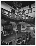 Interiéru vévodí velká obytná místnost, která má výšku přes dvě podlažní vily, a navazují na ni další menší prostory.[3] Spodní podlaží tak sloužilo jako společenská část domu a pokoje a ložnice členů rodiny se nacházely na poschodí.[5] Tyto místnosti byly přístupné po schodišti a pavlači po obvodu haly. Nábytek tvořily unikátní kusy inspirované rustikální lidovou tradicí a secesní dekorativností.[3] Celý interiér, od koberců a potahových látek až po závěsy a skladbu konstrukcí, je laděn v teplých červenavých, modravých a žlutohnědých tónech.[5]