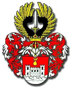 V červeném štítě stojí na skále vystupující z moře hrad ze stříbrných kvádrů, sestávající ze dvou postranních věží, z nichž každá je prolomena černým oknem a pod ním jednou černou střílnou, spojených střední traktem se třemi černými střílnami vedle sebe. Hrad má cimbuří ve tvaru vlaštovčích ocasů, střední trakt je převýšen hořícím zlatým granátem. Na štítu spočívá korunovaná turnajová přílba s červeno-stříbrnými přikryvadly. Klenotem jsou dvě rozevřená černá křídla se zlatými letkami, mezi nimi meč se zlatým jílcem a záštitou.[8]