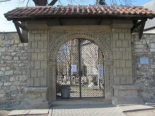 Severní portál je obloukový s bosáží. V klenáku nad ním je vytesaný městský znak, ve vlysu je text modlitby s letopočtem 1577. Po stranách portálu jsou umístěny reliéfy psů hryzajících kosti. Východní brána je zdobená zubořezem, po stranách je dvojice troubících andělů. Kladí nad portálem neslo zmíněný reliéf Vzkříšení syna naimské vdovy.