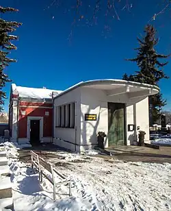 - Při vchodu z Vinohradské ulice je budova správy hřbitova a cca 200 metrů dále na východ obřadní síň. Síň pojme přibližně 20 sedících a přibližně 30 stojících smutečních hostů. Obřadní síň není vytápěna.