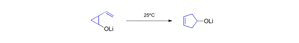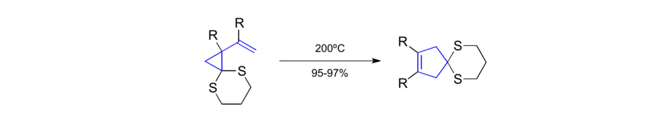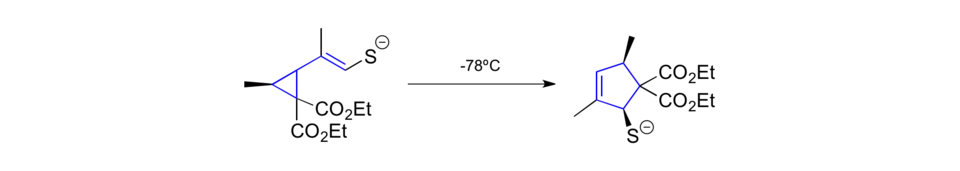 Přesmyky některých vinylcyklopropanů lze uskutečnit i při -78 °C; substráty pro takovéto přesmyky se připravují in situ zmenšováním kruhů thiokarbonylových Dielsových-Alderových aduktů v zásaditých prostředích. Uvedeným způsobem lze stereoselektivně vytvářet vysoce funkcionalizované cyklopenteny;[36]