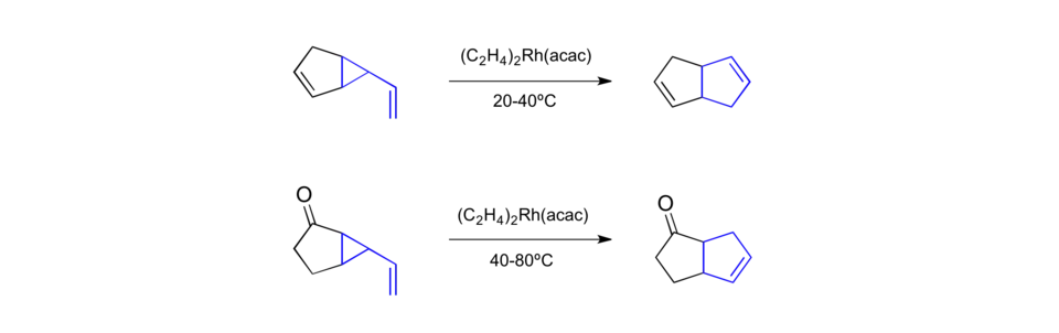 Octan rhodnatý může katalyzovat vinylcyklopropanové přesmyky za teplot pod 80 °C.[33][34]