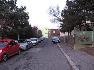 Podél severní strany je parkoviště s podélným parkováním, za ním je ve svahu parková úprava a dětské hřiště. Na jižní straně ulice je mateřská škola a panelový dům.