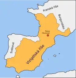 V průběhu 5. století, poznamenaného rozkladem západořímské říše, rozšířili Vizigóti svou moc do střední Galie a dále pronikali do nitra bývalé provincie Hispánie. Dobytí většiny jejího území netrvalo příliš dlouho. Ovládnout se jim nepodařilo pouze severozápadní oblasti, kde se již etablovala moc jiného germánského etnika, Svébů. Po roce 500 se postupně vyhrotily vztahy Vizigótů s Franky, postupujícími pod vedením krále Chlodvíka od severovýchodu na jih Galie. Vrcholem této konfrontace se stala bitva u Vouillé (507), v níž zvítězili Frankové.