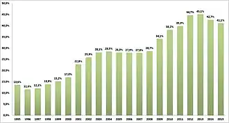 Růst vládního dluhu započal rokem 1996 a zastavil se až v roce 2013, přičemž za toto období se jeho hodnota zvýšila o více než 1,63 bilionu Kč.[4] Tento negativní trend nezastavil ani silný výkon ekonomiky v letech 2004 až 2007, kdy hrubý domácí produkt rostl v průměru o 6 % ročně.
