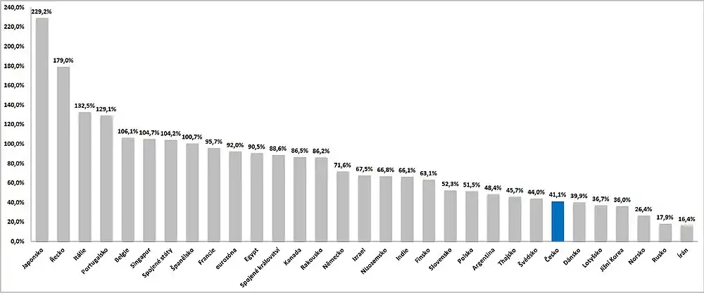 Česká republika má v porovnání s nejvyspělejšími zeměmi světa jeden z nejnižších vládních dluhů.[11] Jeho výše k HDP navíc již druhým rokem klesá a nominálně zůstává stabilní. Tímto trendem se z EU může chlubit už jen dalších 11 zemí.[2] Ministerstvo financí České republiky navíc do budoucna předpokládá další mírný pokles vládního dluhu, v nejhorším pak jeho stagnaci.[12] Velmi příznivé postavení České republiky na poli zadlužení a samotného hospodaření se odráží ve zlepšujícím se hodnocení finanční situace republiky, které získává renomovaných světových ratingových agentur. Naopak mnoha zemím Evropy byl ve spojitosti s neudržitelným zadlužováním rating snížen (Řecko, Itálie, Španělsko, Portugalsko, Francie, Belgie a další).