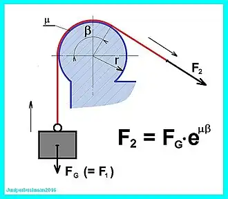 Ideální nehmotné vlákno je zatížené na konci silou (břemenem), tažené přes ideální válcovou plochu o poloměru r, s níž má součinitel Coulombova smykového tření , tak, že se dotýká v úhlu (takzvaný úhel opásání), musí být taženo silou , pro kterou platí takzvaný Eulerův-Eytelweinův vzorec: