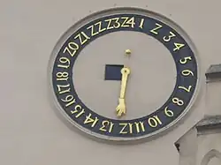 Ciferník, který zobrazoval časový údaj, se nazývá čtyřiadvacetník. Typický italský čtyřiadvacetník, například v Benátkách, je pevný s číslem 24 situovaným na pravé straně. Čtyřiadvacetník na pražském orloji byl výjimečný tím, že má pohyblivý ciferník, který je považován za první a ve své době unikátní v tom, že skloubil astroláb (zobrazení pohybů slunce) se zobrazením italského času.[2]