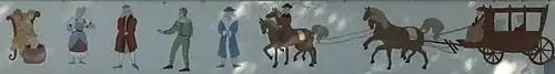 Obraz má rozměry dlouhého pásu, na němž jsou postupně zobrazeny jednotlivé postavy. Zleva sedí na suchém pahýlu sova, což značí noční událost. Následují dvě komorné, mezi nimiž sedí kněžna beroucí lázeň na nohy, poté je zobrazen kníže, šašek a komorník. Druhou polovinu zabírá kočár tažený čtyřmi koňmi, který vedou dva kočí, v kočáře sedí knížecí pár s dvěma komornými. Výjev kočáru značí, že se událost odehrála na cestě.[6]