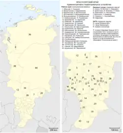 Krasnojarský kraj se člení na 44 rajónú a 17 měst (okruhů), z toho 4 města jsou uzavřená města.