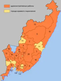 Přímořský kraj se člení na 12 městských okruhů, 8 obecních okruhů a 14 rajónů. Seznam není úplný.