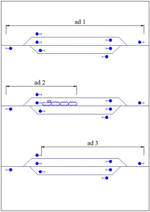 - 2) odjíždějící – je to úsek od konce stojícího vlaku po vjezdové návěstidlo pro opačný směr jízdy.