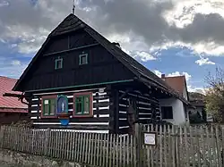 Interiér roubené chalupy a expozice pěstování a zpracování lnu a vlny – názorná ukázka, interiér roubenky s ukázkou předení a tkaní.[4]