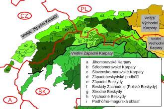 | Podřazené jednotky | Jihomoravské Karpaty, Středomoravské Karpaty, Slovensko-moravské Karpaty, Západobeskydské podhůří, Západní Beskydy, Stredné Beskydy, Východné Beskydy, Podhôľno-magurská oblasť |