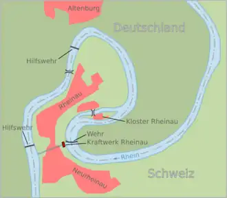 Právním základem projektů energetických děl na horním Rýnu se stala smlouva mezi Bádenskou republikou a Švýcarskem O společném využívání vodní cesty Bodamské jezero-Basilej ze dne 28. března 1926. Projekt na výstavbu elektrárny u Rheinau byl předložen v roce 1942 a potřebná koncese byla vydána v prosinci 1944. Odpor k výstavbě byl podpořen 150 000 podpisy i demonstrací odpůrců stavby v únoru 1952. Tehdy 10 000 lidí protestovalo za zvuků zvonů kláštera Rheinau i za zpěvu dětského sboru.[1] Druhý den stavební práce bez překážek pokračovaly. V únoru 1954 však již dalších 60 000 podpisů vyvolalo referendum pro zrušení stavební koncese. Proti stavbě se vyslovilo 31 % voličů při účasti 52 %. Pravidelný provoz byl zahájen v roce 1957. Každopádně protesty proti stavbě elektrárny byly první celonárodní ekologickou aktivitou ve Švýcarsku a daly popud ke vzniku organizace Rheinaubund, která v roce 2012 přešla v nejúčinnější iniciativu na ochranu vod v zemi pod názvem AQUA VIVA .