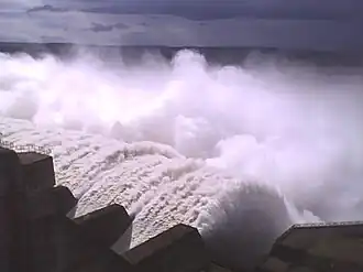 Přehradní nádrž byla vybudována ve dvoukilometrovém řečišti řeky a skládá se ze zemní sypané a betonové části. Celková délka je spolu s pomocnými hrázemi 12,5 km, hlavní část je dlouhá 6,9 km. Lomená betonová část o délce 1450 m se skládá z přelivové hráze a dvou hrází s elektrárnami. Výška hráze nad terénem je 78 m, celková výška však při mohutných hlubokých základech činí 106 m. Přelivový systém obsahuje 20 polí o šířce 21 m a umožňuje přeliv 110 000 m³/s, což v době dostavby 1. etapy byla nejvyšší hodnota na světě. Tento průtok spolu s celkovou hltností elektráren umožňuje převod dvojnásobku stoleté povodně a byl dimenzován na tuto hodnotu pro schopnost rychlého převodu vody v případě rychlých kulminačních vln. Takové řešení pak umožňuje celoroční udržovaní vysoké provozní hladiny pro výkony na elektrárnách.
