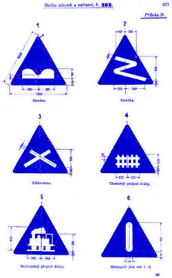Zavádění dopravních značek předpokládala a požadovala Pařížská konvence z roku 1909 a její dodatek z roku 1926. Povinnost správ silnic umístit výstražné značky stanovil v § 68–71 zákon č. 81/1935 Sb., o jízdě motorovými vozidly. Vládním nařízením č. 203/1935 Sb. n. a z. bylo od 1. listopadu 1935 na území Československa oficiálně zavedeno prvních šest druhů výstražných značek (1. Stružka, 2. Zatáčka, 3. Křižovatka, 4. Chráněný přejezd dráhy, 5. Nechráněný přejezd dráhy a 6. Nebezpečí jiná než 1–5). Tyto značky měly již tvar rovnostranného trojúhelníku o straně 1000 mm, avšak symboly byly provedeny bíle na modrém podkladě (bez orámování). Symboly byly již podobné dnešním.