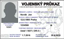 - ↑ Vyhláška ministerstva obrany č. 328/2016 Sb., o stanovení vzoru dotazníku, vzorů vojenských dokladů a nakládání s nimi a vzoru osobní známky a pravidel jejího nošení. In: Sbírka zákonů. 2016. Dostupné online. § 4. Ve znění pozdějších předpisů. Dostupné online.