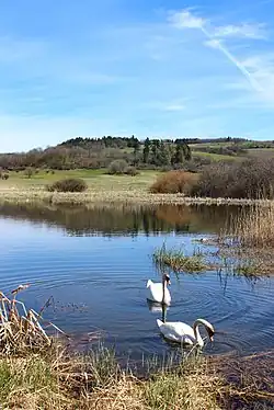 Zelený rybník na Lomnickém potoku na jižní hranici újezdu. V pozadí nepojmenovaná kóta 788 metrů severně od obce Hradiště.