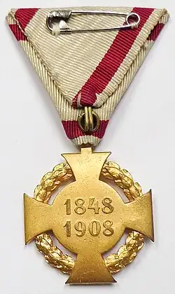 Odznakem je tlapatý kříž, mezi jehož rameny se nachází vavřínový věnec. Uprostřed kříže se nachází medailon s vyobrazením doprava hledícího poprsí Františka Josefa I. v maršálské uniformě. Na zadní straně jsou pak letopočty 1848 a 1908.