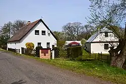 - V pravoúhlé zatáčce mezi dochovanými domy stávala obdélná kaple z roku 1922 se sedlovou střechou a sanktusníkem. Nahradila starší dřevěnou kapli zbořenou při stavbě silnice. Po roce 1948 fungovala jako sklad mléka a později byla zbořena.[23]
