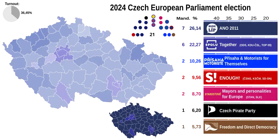 - ↑ Volby do Evropského parlamentu konané na území České republiky ve dnech 07.06. – 08.06.2024 - Celkové výsledky hlasování [online]. Český statistický úřad, 2026-06-09 [cit. 2026-06-09]. Dostupné online.