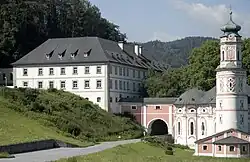 - Kostel sv. Karla Boromejského v raně barokním slohu dal podle svého projektu postavit tyrolský lékař Hippolyt Guarinoni († 1654) a je zde pohřben před oltářem v první kapli vpravo od vchodu; fresky vytvořili Caspar Waldmann a Martin Knoller; kaple sv. Anny.[8]